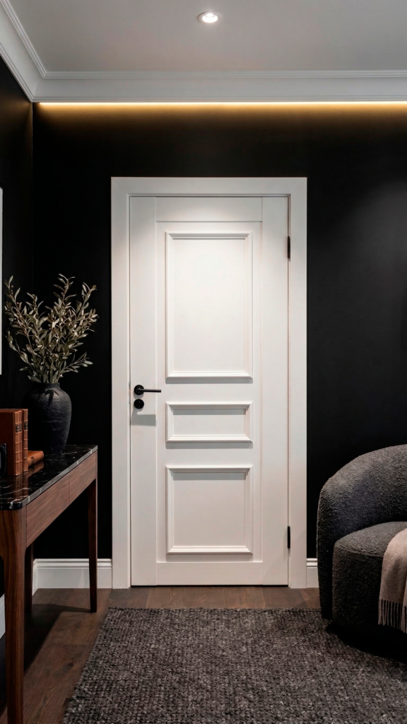 Design clássico e imponente, destacado por uma composição simétrica de painéis com molduras robustas em alto relevo. Essa estruturação geométrica cria um sofisticado jogo de profundidade e volume. A superfície lisa garante um visual majestoso e atemporal ao projeto.