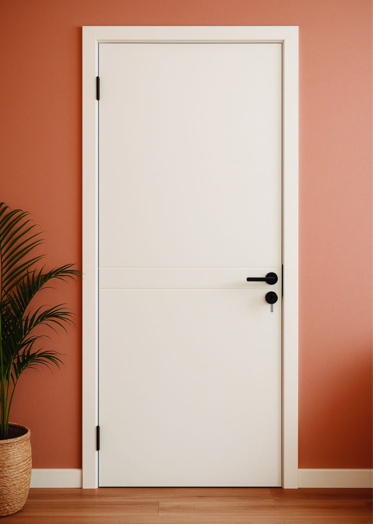 Composição equilibrada destacada por um duplo friso horizontal em baixo-relevo na altura da fechadura. Essa marcação transversal quebra a continuidade do painel liso de forma sutil, adicionando proporção e modernidade através de um detalhe pontual.