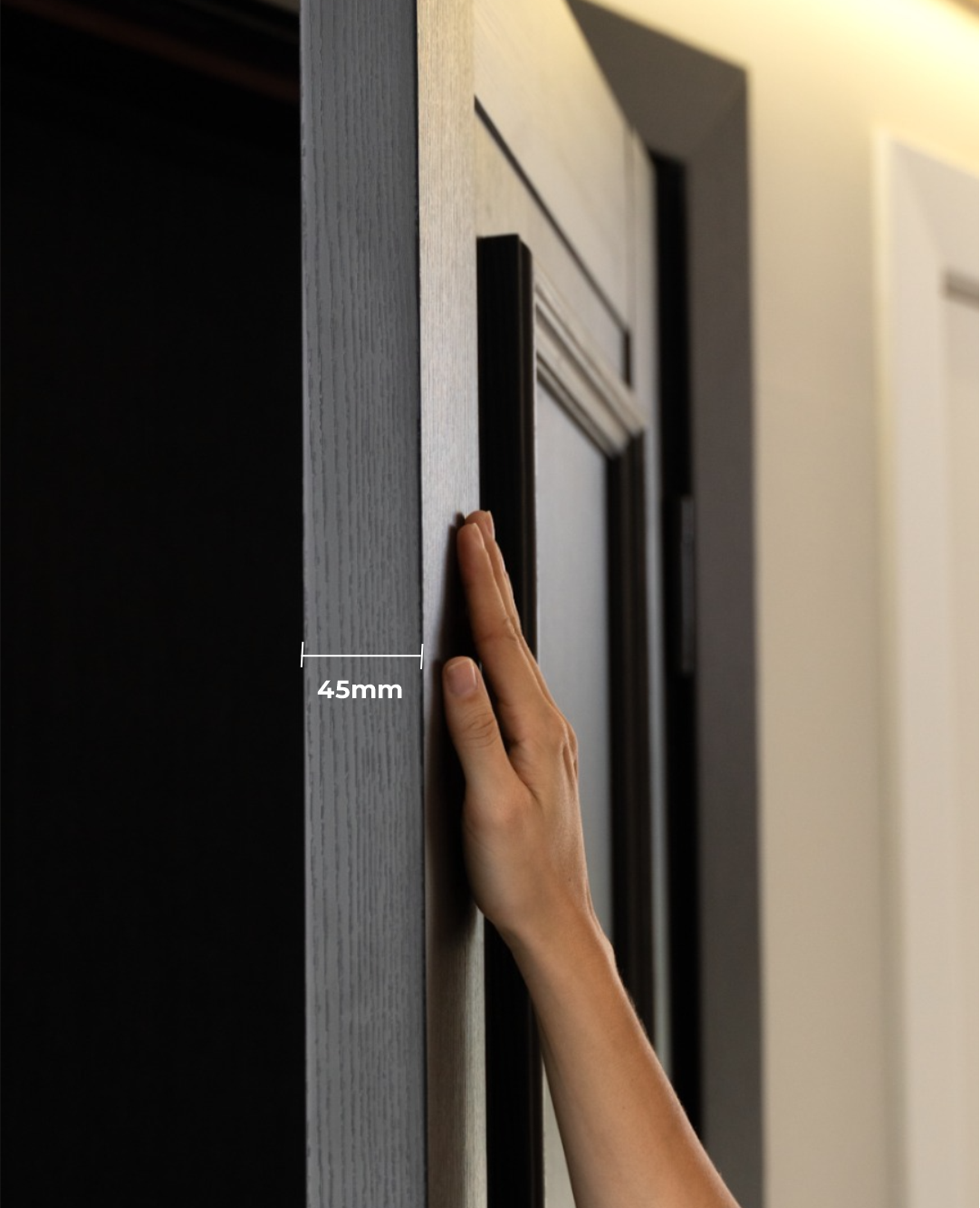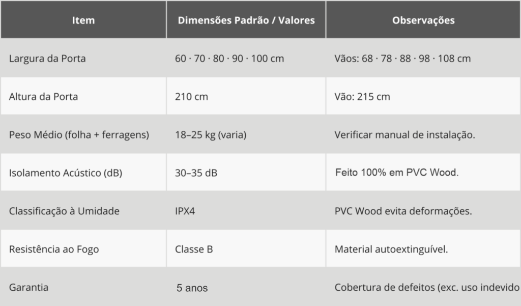 Mais espessa que portas convencionais, pensada para garantir melhor encaixe, vedação e resistência no uso.