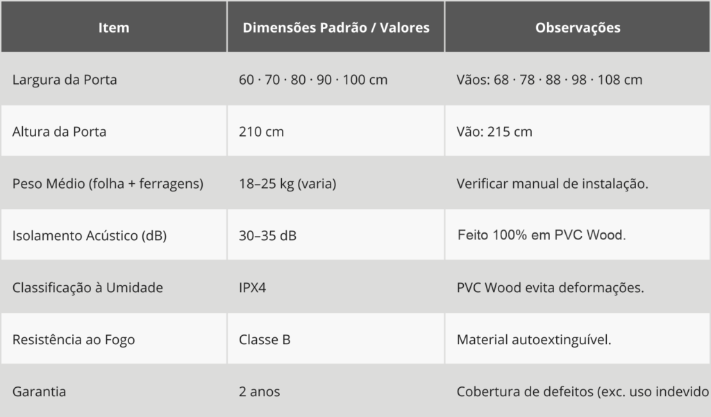 Mais espessa que portas convencionais, pensada para garantir melhor encaixe, vedação e resistência no uso.